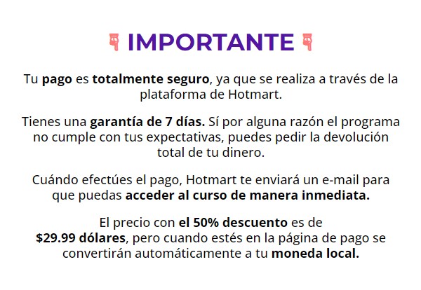 Nuestro programa está soportado por la plataforma Hotmart®, un portal de cursos educativos donde tienes una garantía de satisfacción de 7 días. Si por alguna razón sientes que el curso no es para ti o no estás satisfecho al 100%, te devolvemos tu inversión, sin preguntas ni objeciones.